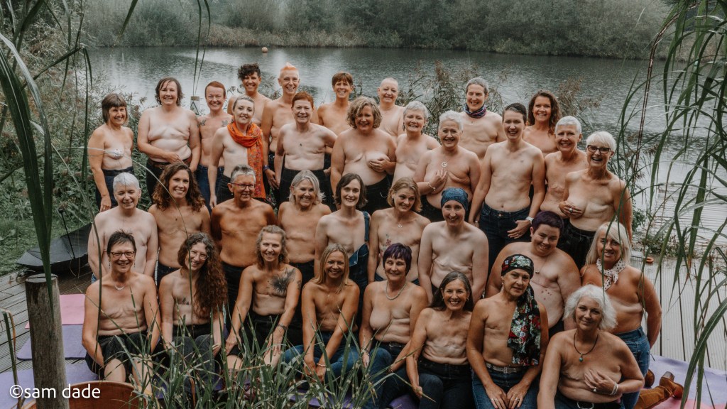 So, where the hell are these women? Well, on this particular Sunday morning there were a lot of us gathering amongst the greenery in a garden centre – fear not, it was closed. We took care to spare any blushes should any aspiring Alan Titchmarshes be out shopping. As we arrive there are some nervous giggles, a few tears, hugs and smiles. Most of us have never met before. And if we have it’s mostly been online – even in pre pandemic times. Photographer Sam Dade invites us all to remove our tops and bare our single or absent breasts. It’s a little chilly and there’s a persistent drizzle in the air but once we start there’s really no stopping us. It’s liberating and there are lots of us. Safety and solidarity in numbers. It makes me want to cry – good tears. There’s a small barn where we divest ourselves of our upper garments – I’m a bit slower than most because I’m careful not to put my stick on prosthesis down where it may pick up a piece of grit. A gritty tit while queuing through the Dartford Tunnel will wreck my drive home. Like all women we come in all shapes and sizes. I get scar and tattoo envy. It may be a little rude to stare, and it certainly wouldn’t be the done thing in a changing room down my local pool, but here each woman’s body truly tells a story. Personally, I don’t like the bravery narrative – I’m not brave, I couldn’t pick up a spider. I also struggle with the word choice when people ask me why I haven’t chosen to have a reconstruction, I didn’t choose to have cancer, lose a tit or marry the wrong man – but I do believe we should be given all the information available to make a decision. I count myself “lucky” that when I needed a second operation for a lymph node clearance the surgeon offered to “tidy up” my scar, who knew we wouldn’t get “tidy” scars in the first place? As we pose for our group pictures we share our stories – of failed reconstructions, the freedom of movement through going flat, of dismissive surgeons who leave us unhappy with our bodies, of the thoughts behind tattoo designs to decorate our scars, of acceptance and being at peace with our bodies. On this particular day I can take strength from my body and the story it tells. I get strength from the other women around me. I know that there will always be days when I don’t have that confidence, when I struggle to accept the body as it now is. But since my active treatment ended those days are further apart. And when I am struggling I will remember the women in this photo shoot. Forgetting the misleading headlines and the insensitive remarks about someone’s Aunt’s sister-in-law who got a boob job courtesy of a breast cancer diagnosis and now skydives after running ultra marathons I’ll take heart from remembering all the topless women I met in that Garden Centre on that day.